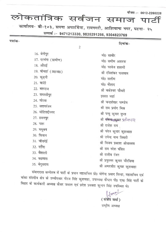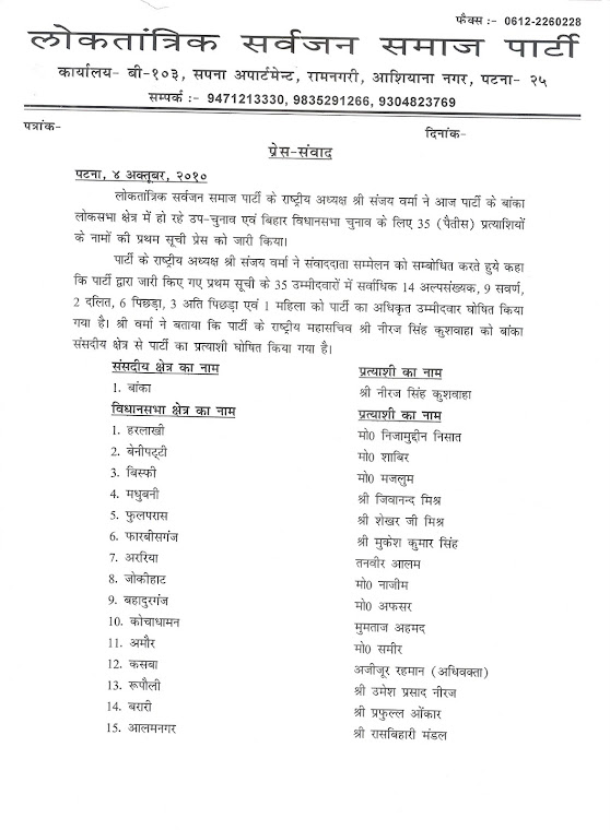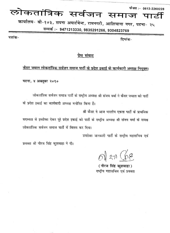 लोकतान्त्रिक सर्वजन समाज पार्टी के राष्ट्रीय अध्यक्ष श्री संजय वर्मा ने श्री राघवेन्द्र सिंह कुशवाहा को पार्टी के बिहार इकाई अध्यक्ष बनाये जाने की घोषणा की .उन्होंने कहा की समाजवाद में अटूट आस्था रखनेवाले साथियों द्वारा निर्मित इस पार्टी ने आसन्न बिहार विधान सभा के चुनाव में अधिक से अधिक युवाओ को प्रत्याशी बनाने का फैसला किया है .